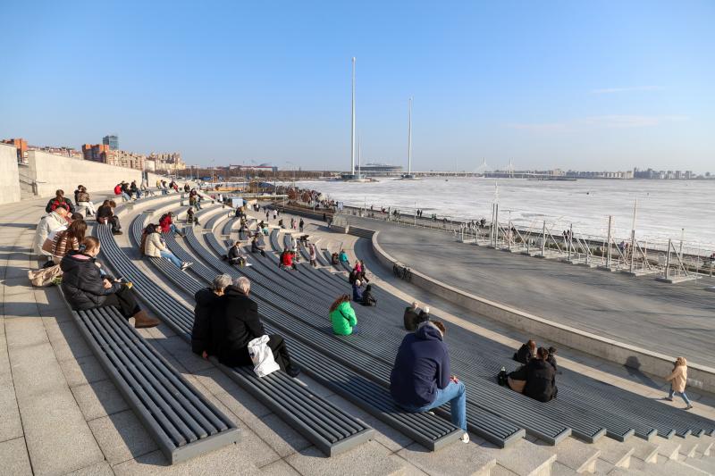 В Петербурге четвертый день подряд теплая погода радует жителей и гостей города. «Петербургский дневник» предлагает посмотреть, как проходит самый жаркий день с начала года на Открытой набережной – около «Лахта Центра».