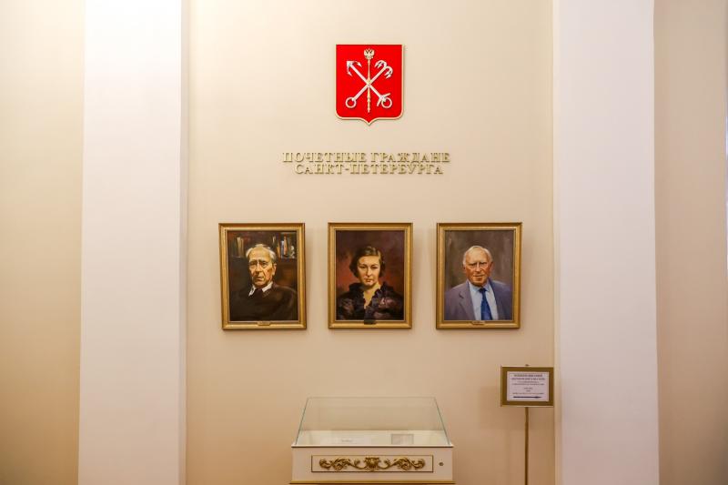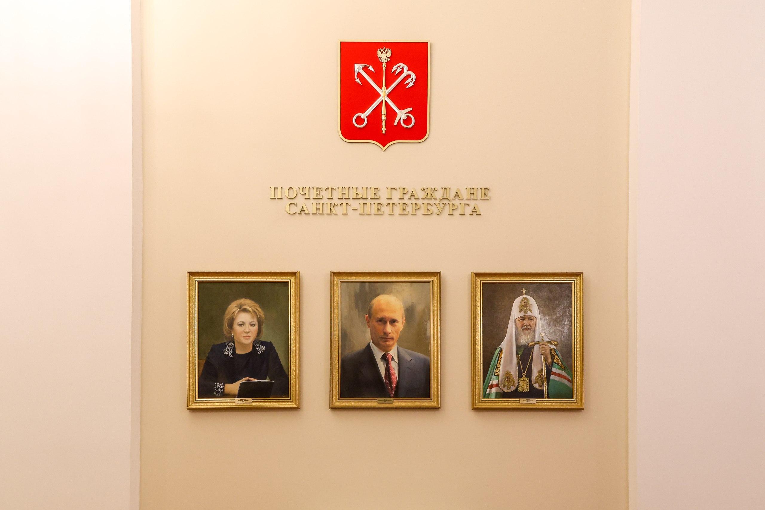 В центральной группе галереи располагается герб города, и рядом с ним размещены портреты почетных жителей Петербурга Владимира Путина, Валентины Матвиенко и патриарха Кирилла.