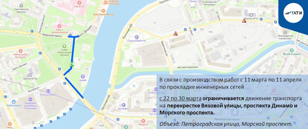 В Петроградском районе с 22 по 30 марта ограничивается движение транспорта на перекрестке Вязовой улицы, проспекта Динамо и Морского проспекта, сообщили сегодня в пресс-службе Государственной административно-технической инспекции.