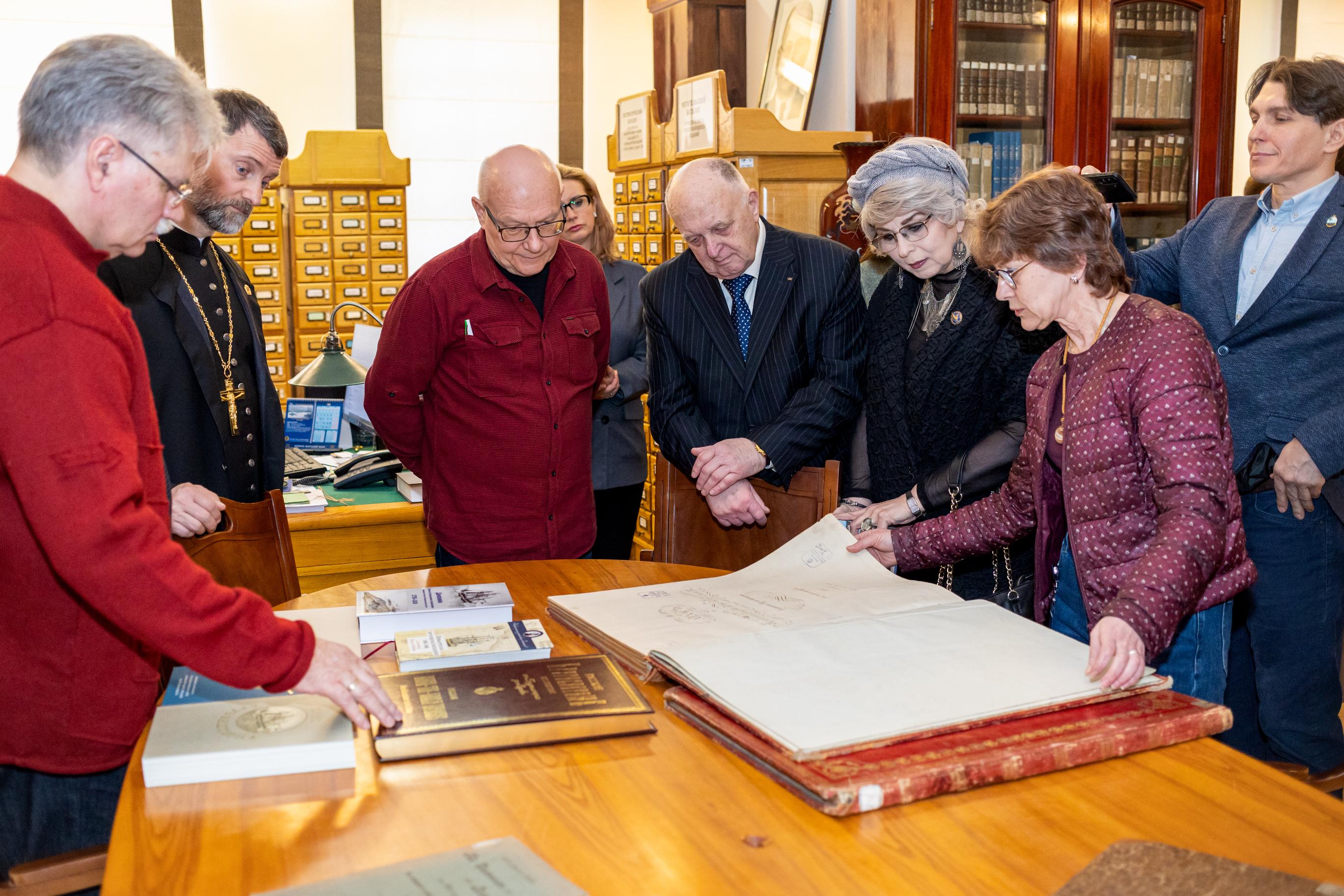 Встреча началась с часовой экскурсии по историческому зданию, которое было специально построено для РГО в 1908 году по проекту архитектора Гавриила Барановского. Как рассказал гостям директор штаб-квартиры РГО в Санкт-Петербурге Роман Рябинцев, в ней размещаются специализированная библиотека по географии и научный архив организации. В нем хранятся материалы экспедиций и личные предметы выдающихся путешественников и ученых. Роман Рябинцев также продемонстрировал гостям уникальные исторические книги и фолианты, бережно хранящиеся в архивах библиотеки РГО.