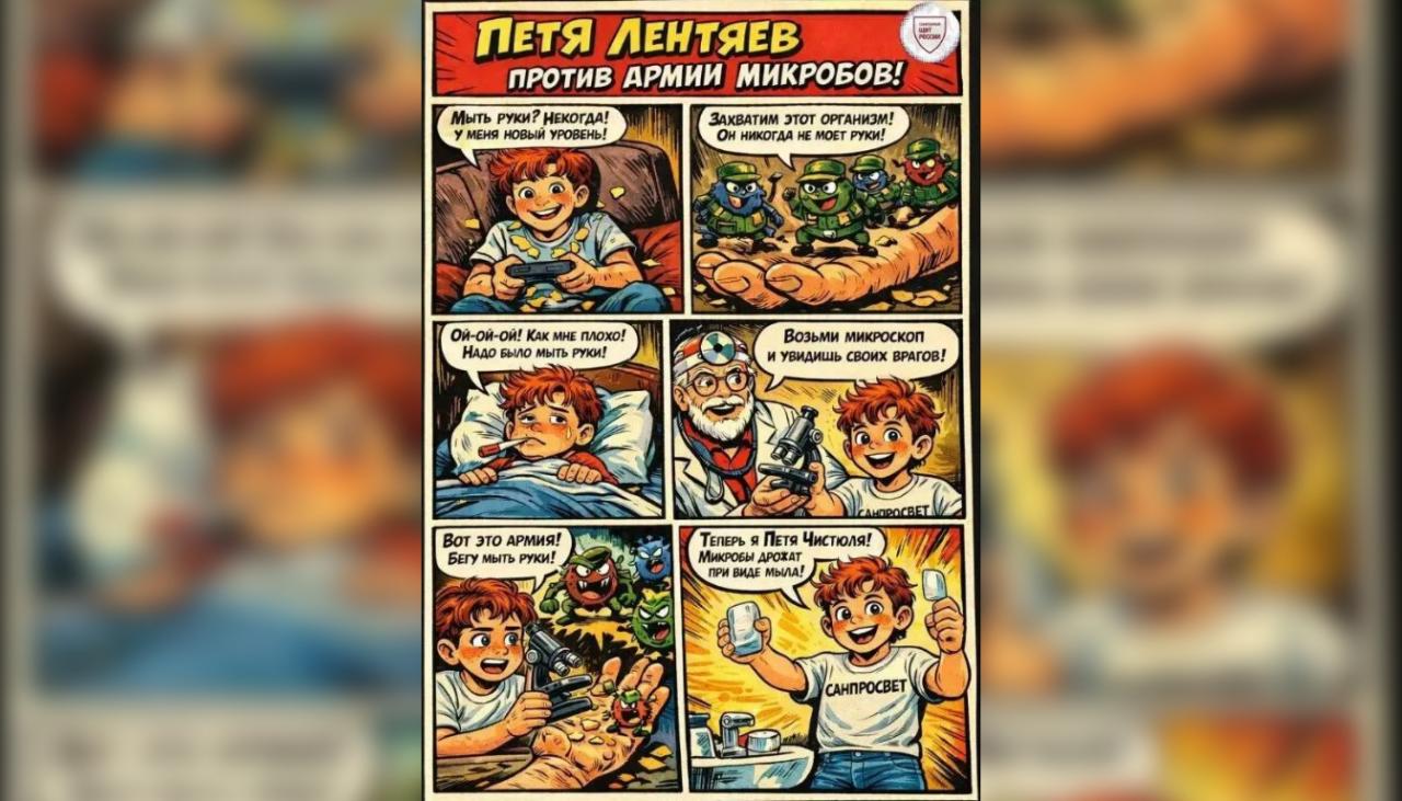Параллельно Роспотребнадзор запускает серию раскрасок, комиксов и инфографики с героем детского «Санпросвета» – Петей Лентяевым. Это веселый школьник, который раньше ленился, но осознал, что соблюдение простых правил гигиены и здоровый образ жизни помогают быть активным, успешно учиться и чувствовать себя бодро. В комиксе «Личная гигиена» персонаж вступает в увлекательную борьбу с армией коварных микробов, помогая юным читателям узнать секретные приемы защиты от невидимых врагов.