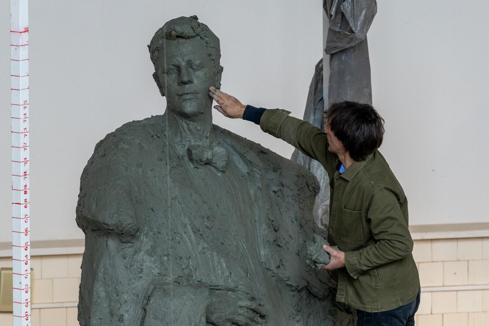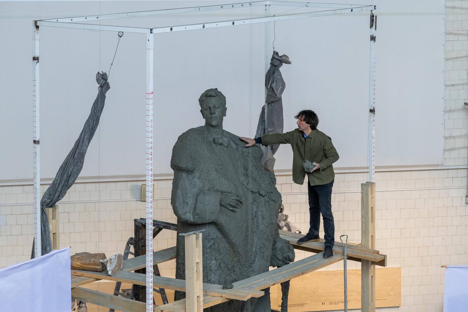 «Сейчас я занимаюсь лепкой деталей: кистей, головы, занимаюсь нахождением общих форм. Глину для лепки нам любезно предоставил петербургский метрополитен, а станок для работы над фигурой – мастерская Аникушина», – рассказал скульптор.