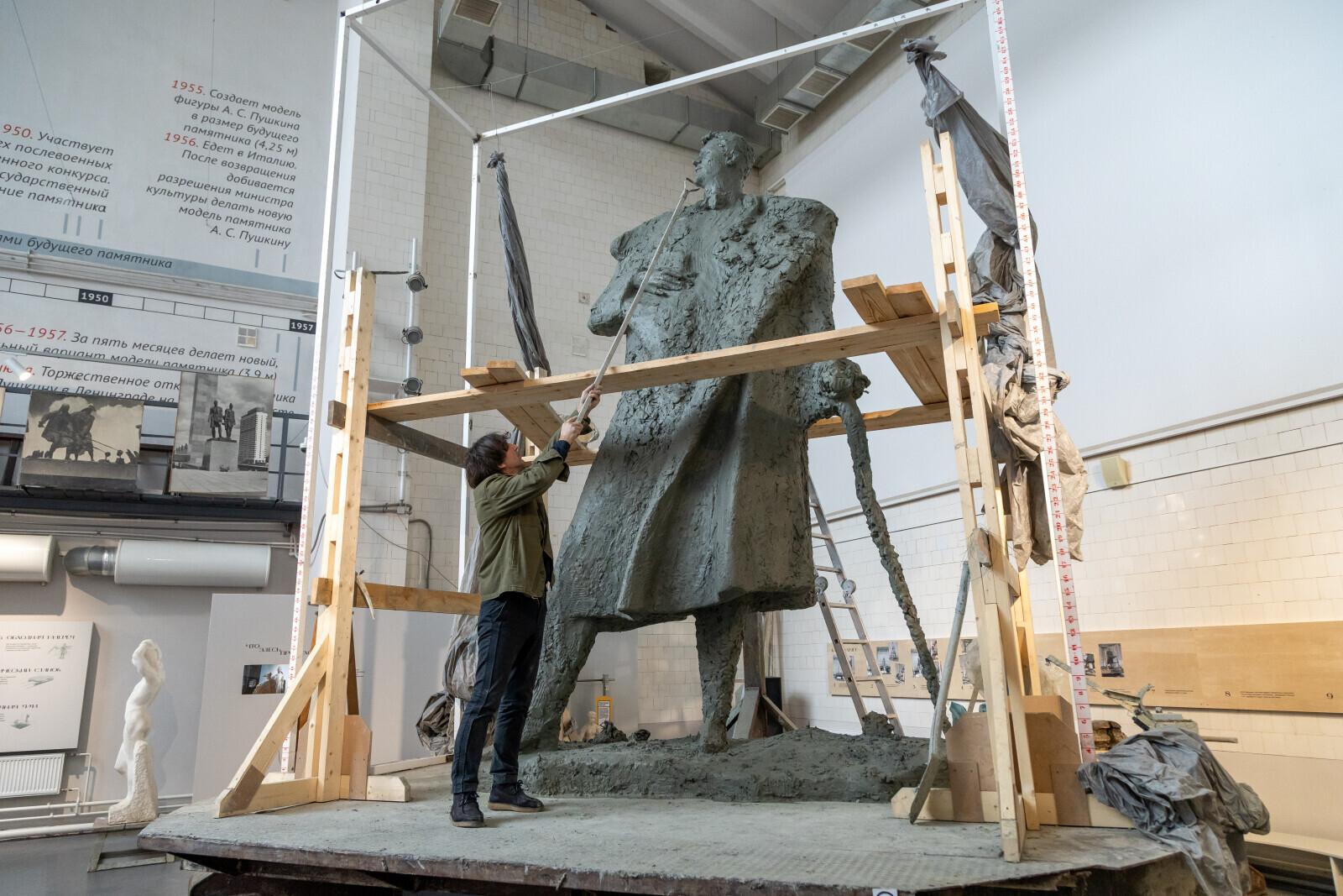 Бронзовый памятник высотой 4,25 метра установят на серый гранитный постамент высотой 96 сантиметров. Точных сроков его монтажа пока нет. Сам скульптор продолжит работу с образом до середины ноября, пока в Мастерской проходит выставка.