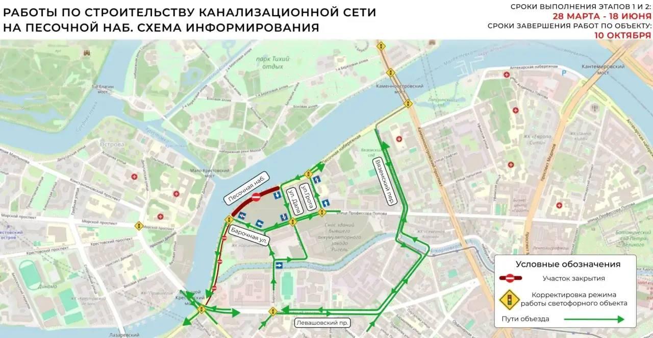 Комитет по транспорту Санкт-Петербурга информирует водителей о введении временных ограничений движения на Песочной набережной. Меры связаны с проведением строительных работ по прокладке канализационной сети. Ограничения будут действовать с 28 марта по 18 июня 2026 года.