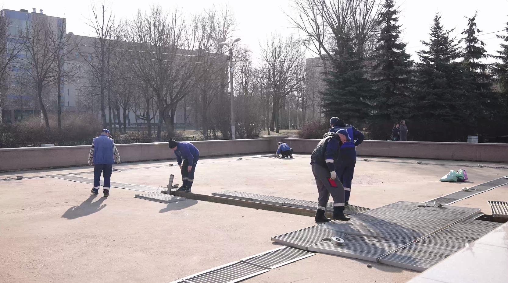 Сейчас рабочие очищают чаши и декоративные элементы щётками и мощным напором воды – убирают мусор, скопившийся за время таяния снега. Проверяют облицовку, при необходимости делают косметический ремонт. Финальный этап: наполнение чаш водой и пробный запуск.