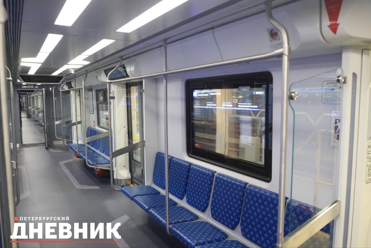 Экран в окне и обновленный интерьер: на синюю линию метро Петербурга вышли новые «Балтийцы»