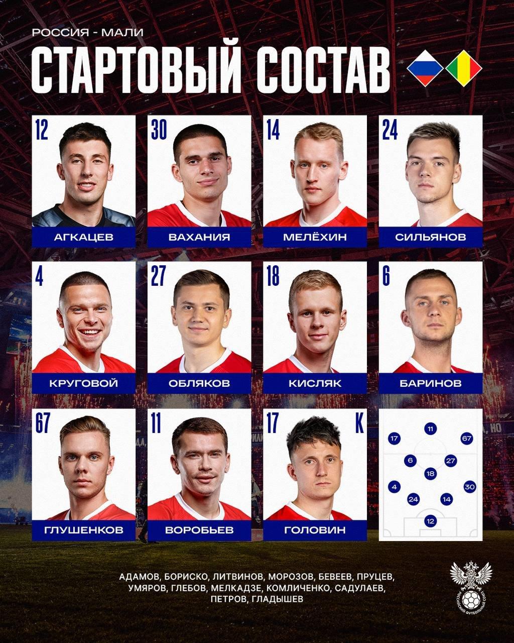 В стартовый состав российской команды вошли: Агкацев, Вахания, Мелёхин, Сильянов, Круговой, Обляков, Кисляк, Баринов, Глушенков, Воробьёв, Головин.
