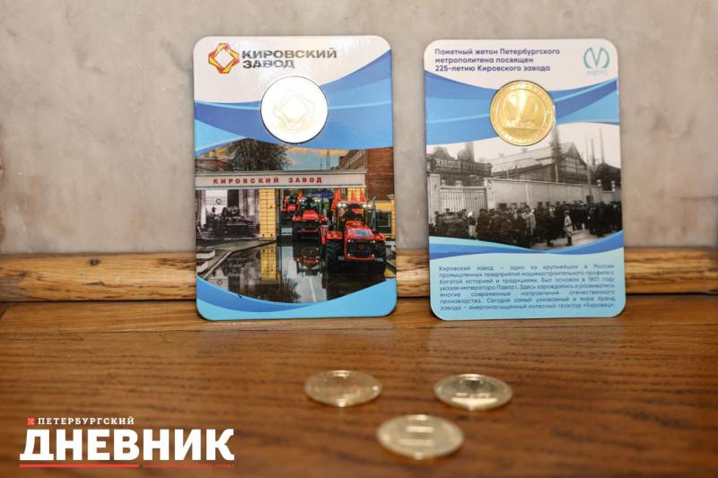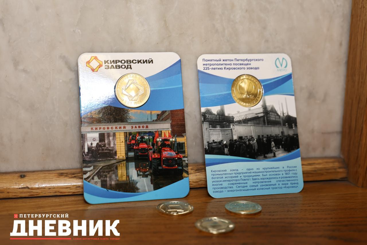 Церемония гашения коллекционного жетона прошла в наземном вестибюле станции метро «Кировский завод». Выпуск приурочили к 225-летию легендарного предприятия. На лицевой стороне изображен классический символ подземки, а на обороной – логотип завода.