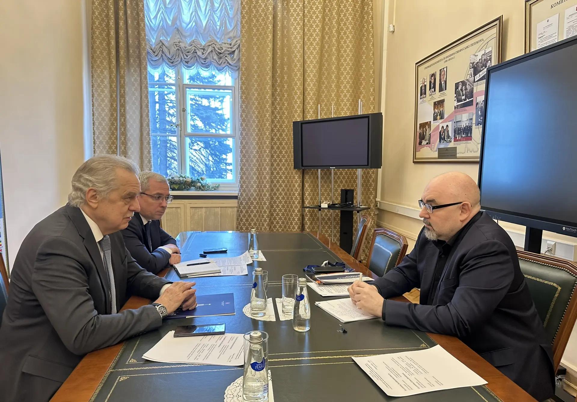 В Смольном состоялась рабочая встреча члена правительства Санкт-Петербурга – председателя Комитета по внешним связям Евгения Григорьева с министром международного и межрегионального сотрудничества Челябинской области Дмитрием Глухаревым. Стороны обсудили перспективы взаимовыгодного двустороннего сотрудничества, в том числе в рамках развития международной кооперации и реализации национального проекта «Международная кооперация и экспорт».