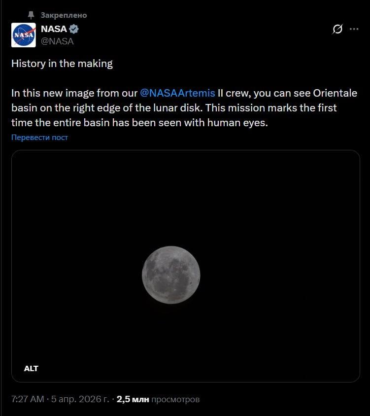 NASA показало фотографию Луны, на которой впервые виден весь бассейн Ориентале. Пост об этом опубликован в соцсетях компании, в частности на странице в X.