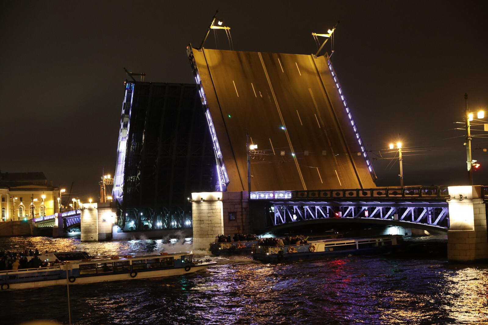 Литейный мост разведут с 01:40 до 04:45, Дворцовый – с 01:10 до 04:55, Благовещенский – с 01:25 до 05:00, Биржевой – с 02:00 до 04:55.