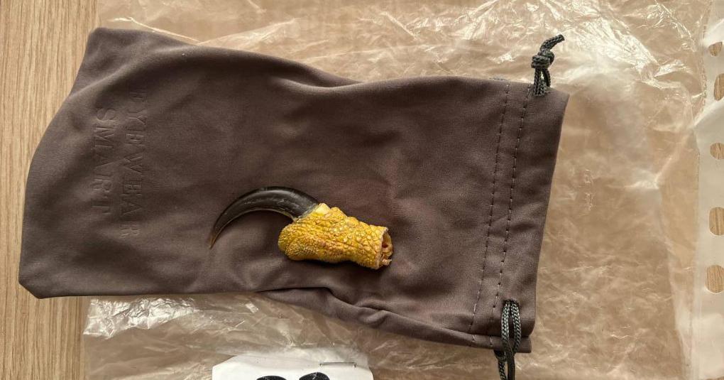 При сканировании ручной клади путешественники были выявлены предметы, по плотности и силуэтам напоминающие когти и рога. В рюкзаке, двух чемоданах и карманах пассажира обнаружили дериваты разных видов животных: клыки, когти, части рогов, фрагменты и срезы бивней мамонта, а также высушенную голову змеи. В общей сложности 67 предметов.