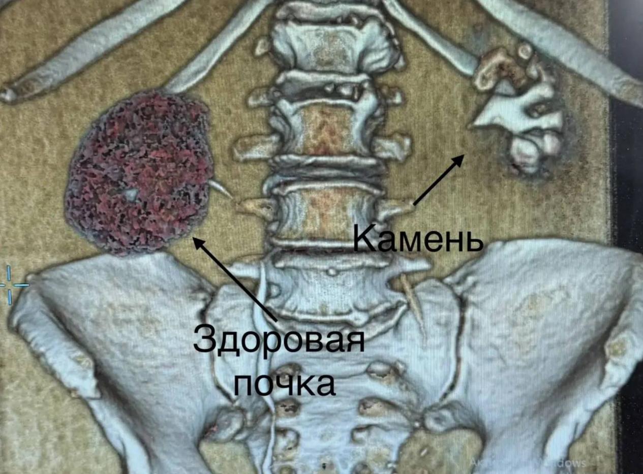 Коралловидный камень заполнил всю чашечно-лоханочную систему почки – это самая тяжёлая стадия мочекаменной болезни (классификация К4). Его размер достигал 5 сантиметров. Сама почка сморщилась до 7,5 сантиметра и перестала накапливать радиофармпрепарат, что подтвердила нефросцинтиграфия.