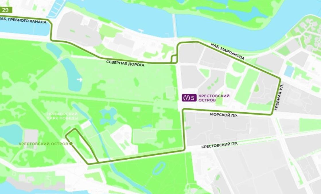 Объезд организуют от станции метро «Крестовский остров». Транспорт направится по Морскому проспекту, затем свернёт на Гребную улицу и выйдет на набережную Мартынова.