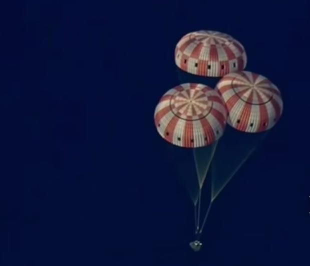 За полчаса до возвращения от корабля штатно отделился служебный модуль, а при входе в плотные слои атмосферы связь с экипажем на несколько минут прервалась из-за образования плазмы. После приводнения ведущий трансляции сообщил, что все четыре члена экипажа находятся в отличном состоянии. Транспортировку корабля и астронавтов на сушу обеспечит корабль ВМС США USS John P. Murtha.