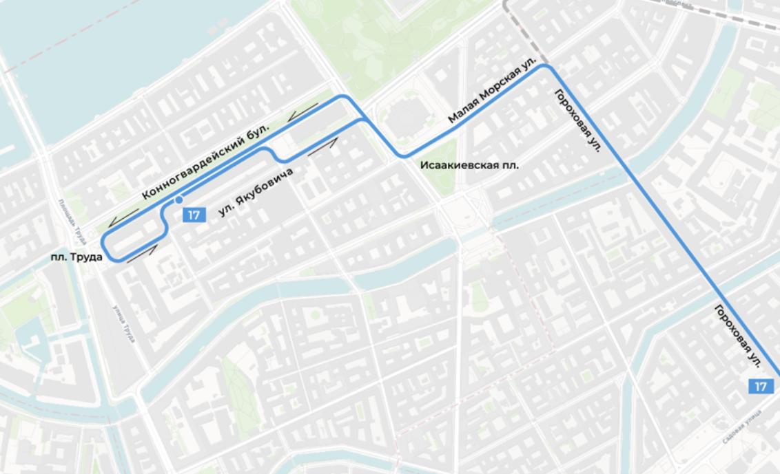 В объезд троллейбусы направят через Гороховую улицу, Малую Морскую улицу, Исаакиевскую площадь и Конногвардейский бульвар. Конечной станет остановка на Конногвардейском бульваре.