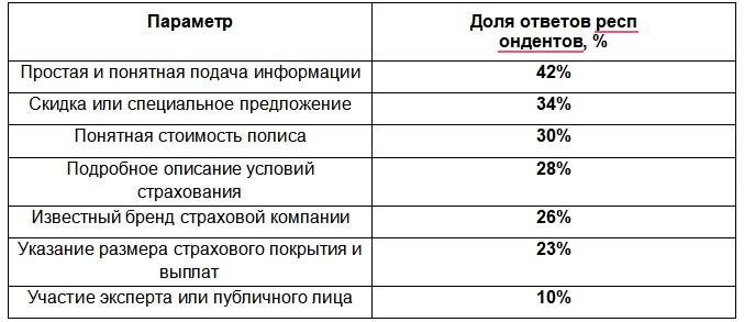 Что касается содержания рекламы, аудиторию прежде всего привлекает простая и понятная подача информации – так ответили 42% опрошенных. Понятная стоимость полиса важна для 30%, подробное описание условий – для 28%, скидки и специальные предложения – для 34%.