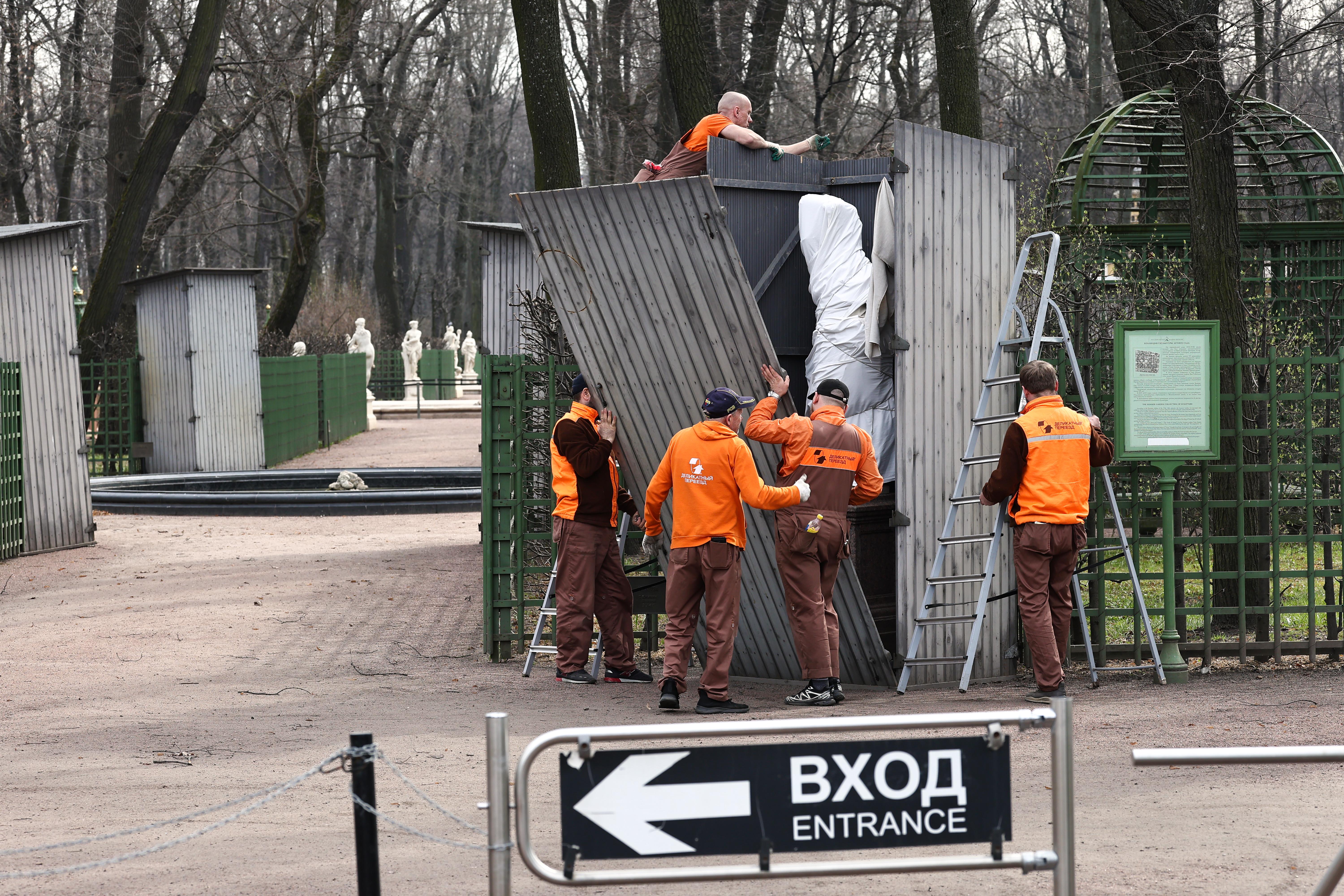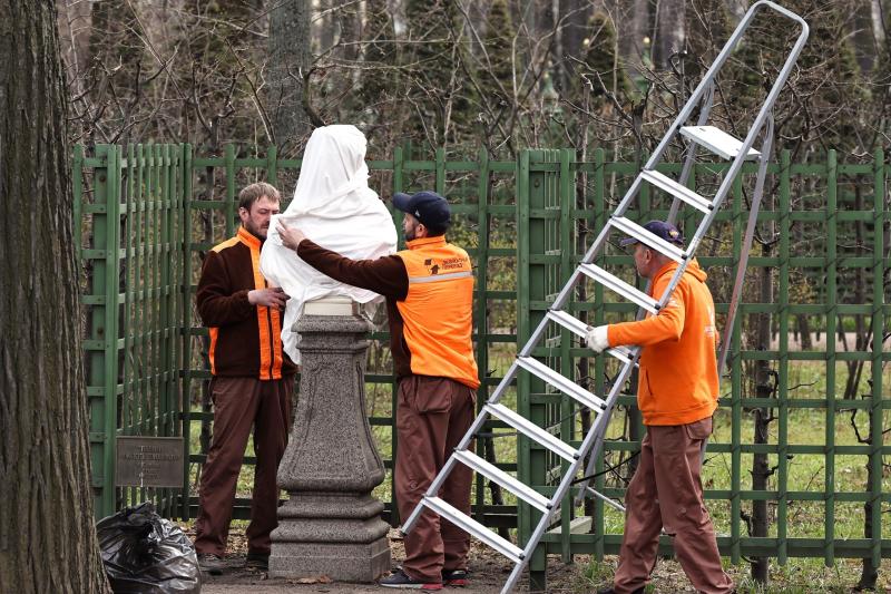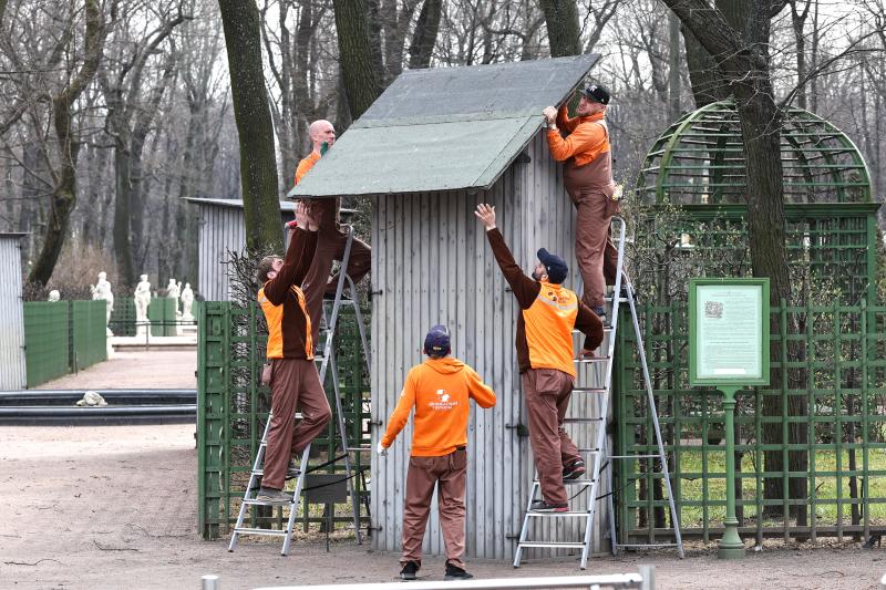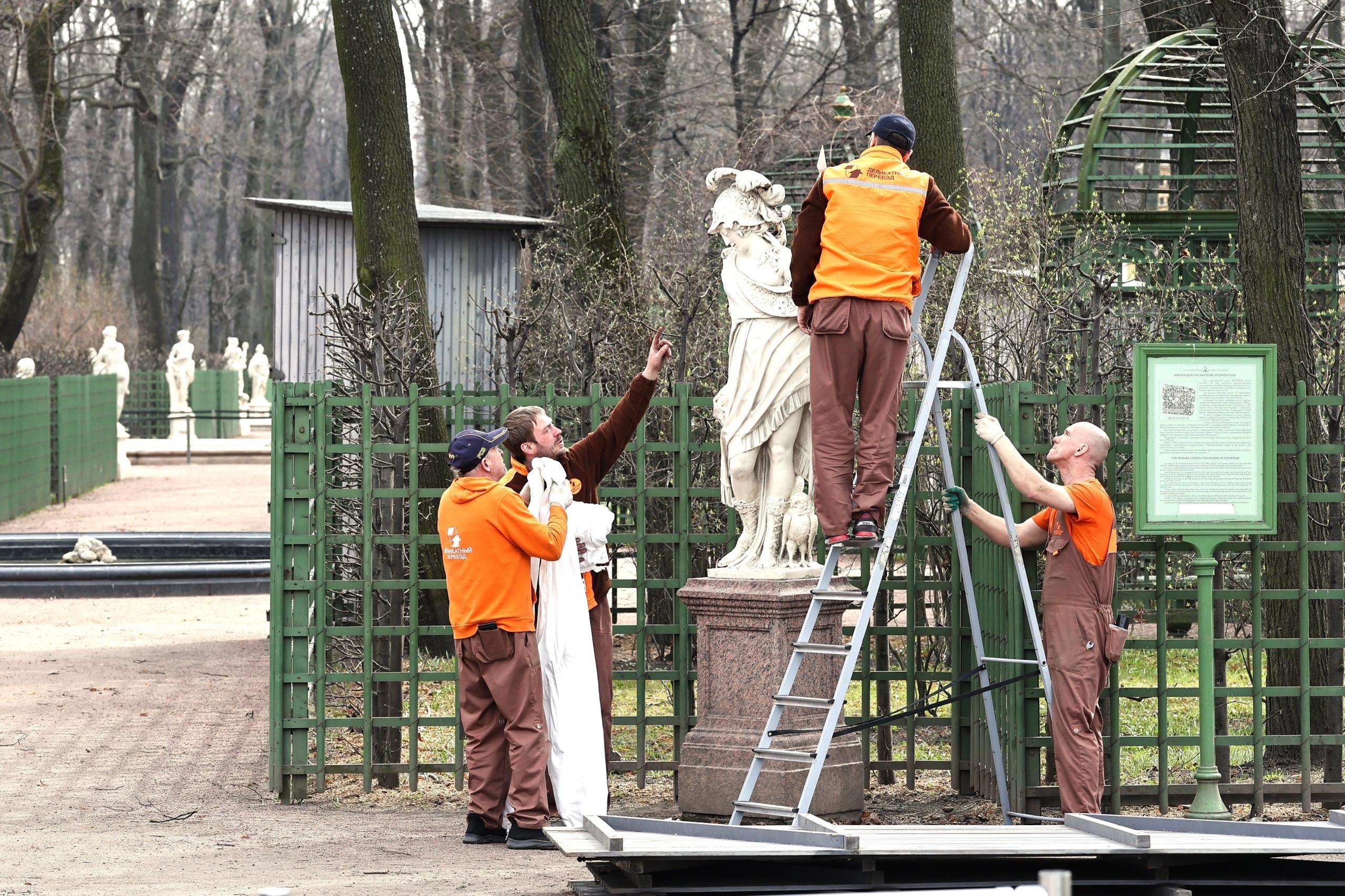Санкт-Петербург уже вовсю готовится к летнему сезону. В парках города начали освобождать от защитных футляров деревья и скульптуры.