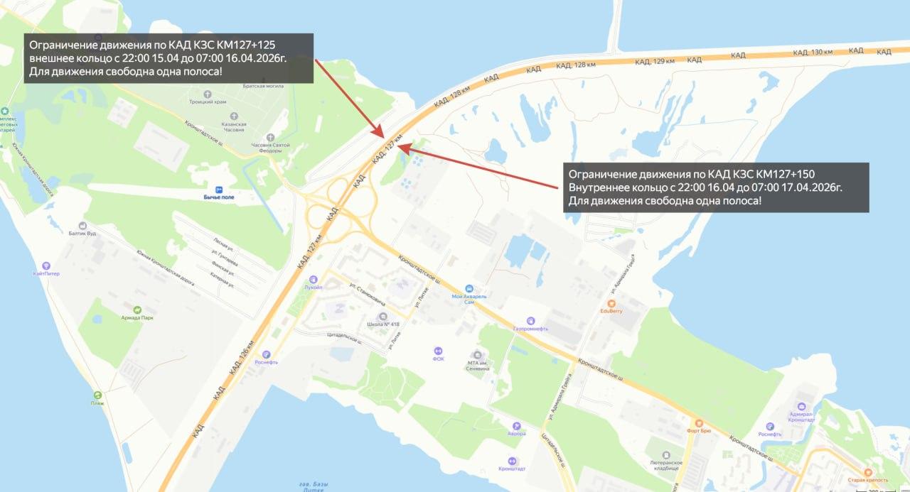 Как сообщает пресс-служба Дирекции Комплекса защитных сооружений (КЗС), в период с 22:00 15 апреля до 07:00 16 апреля будут перекрыты две полосы по внешнему кольцу КАД КЗС на участке КМ 127+125.
