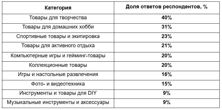 Самая востребованная категория — товары для творчества: рисование, рукоделие и похожие занятия выбирают 40% покупателей. Следом идут товары для домашних хобби — садоводство, кулинария и прочее (31%). Товары для активного отдыха — туризм, рыбалка, охота — и спортивные товары и экипировка покупают по 21% и 23% респондентов соответственно.