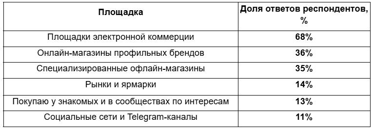 Основная точка покупки — площадки электронной коммерции: их выбирают 68% опрошенных. Онлайн-магазины профильных брендов предпочитают 36%. Специализированные офлайн-магазины, где можно оценить товар лично, посещают 35%.