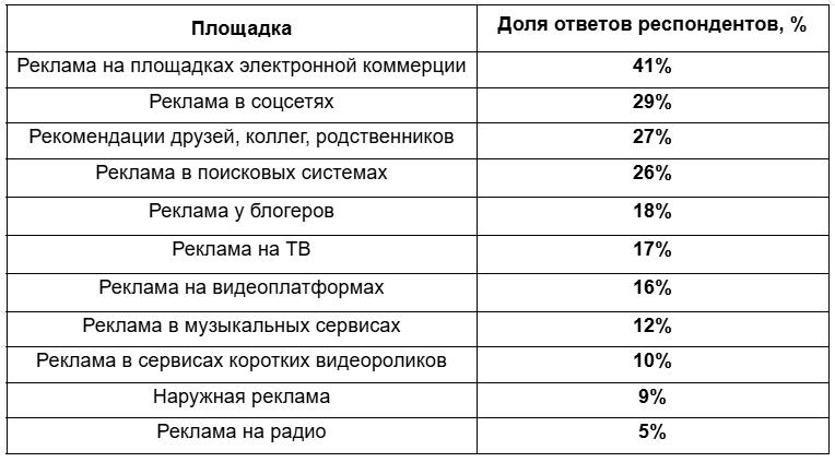 Больше всего к покупке побуждает реклама на площадках электронной коммерции — её отмечают 41% тех, на кого реклама влияет. Далее идут реклама в соцсетях (29%), рекомендации друзей и знакомых (27%) и реклама в поисковых системах (26%). Реклама у блогеров влияет на решение 18% покупателей, на телевидении — 17%, на видеоплатформах — 16%, в музыкальных сервисах — 12%, в сервисах коротких видео — 10%, наружная реклама — 9%, реклама на радио — 5%.
