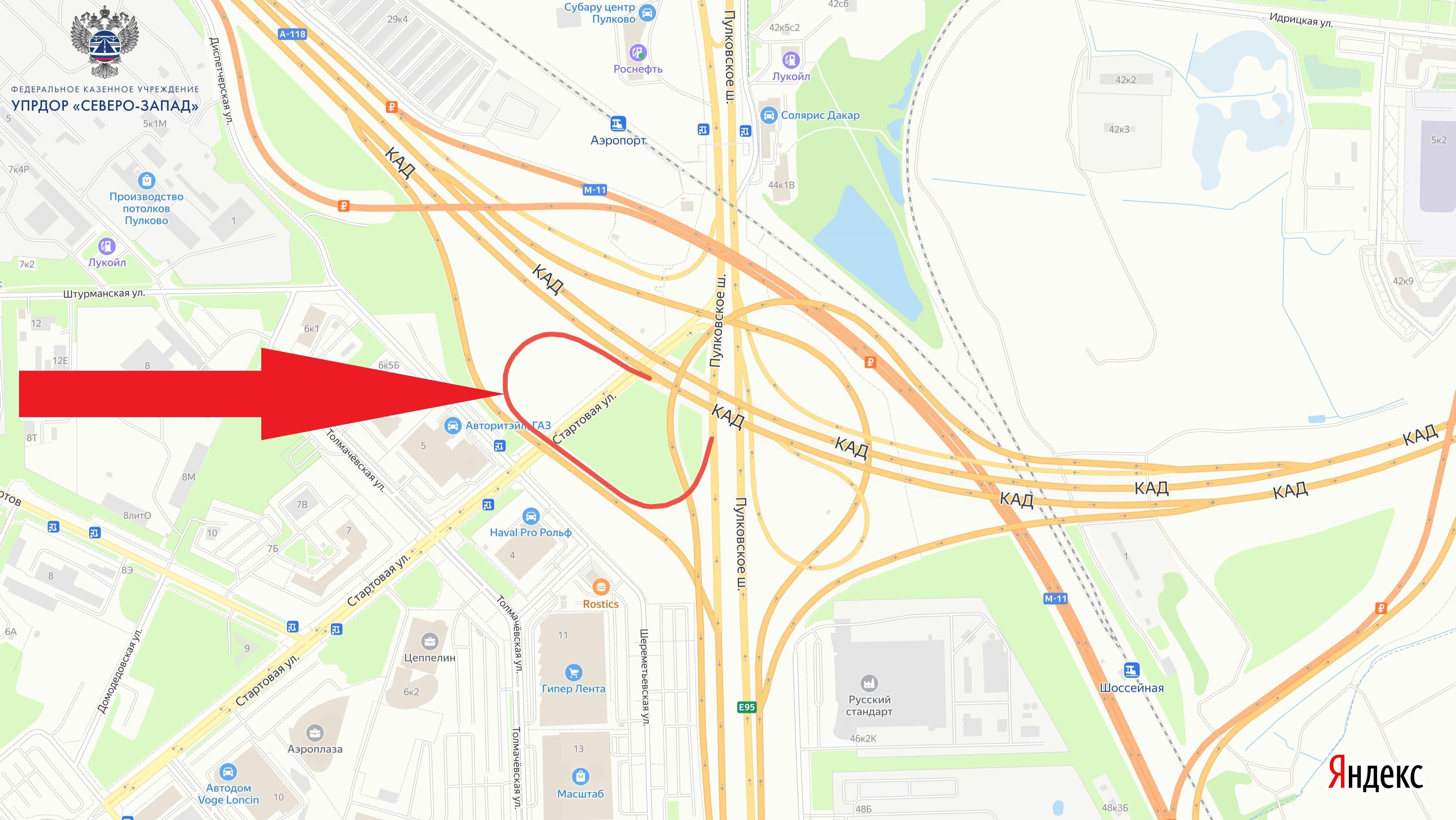 Съезд с Пулковского шоссе на внешнее кольцо КАД полностью перекроют