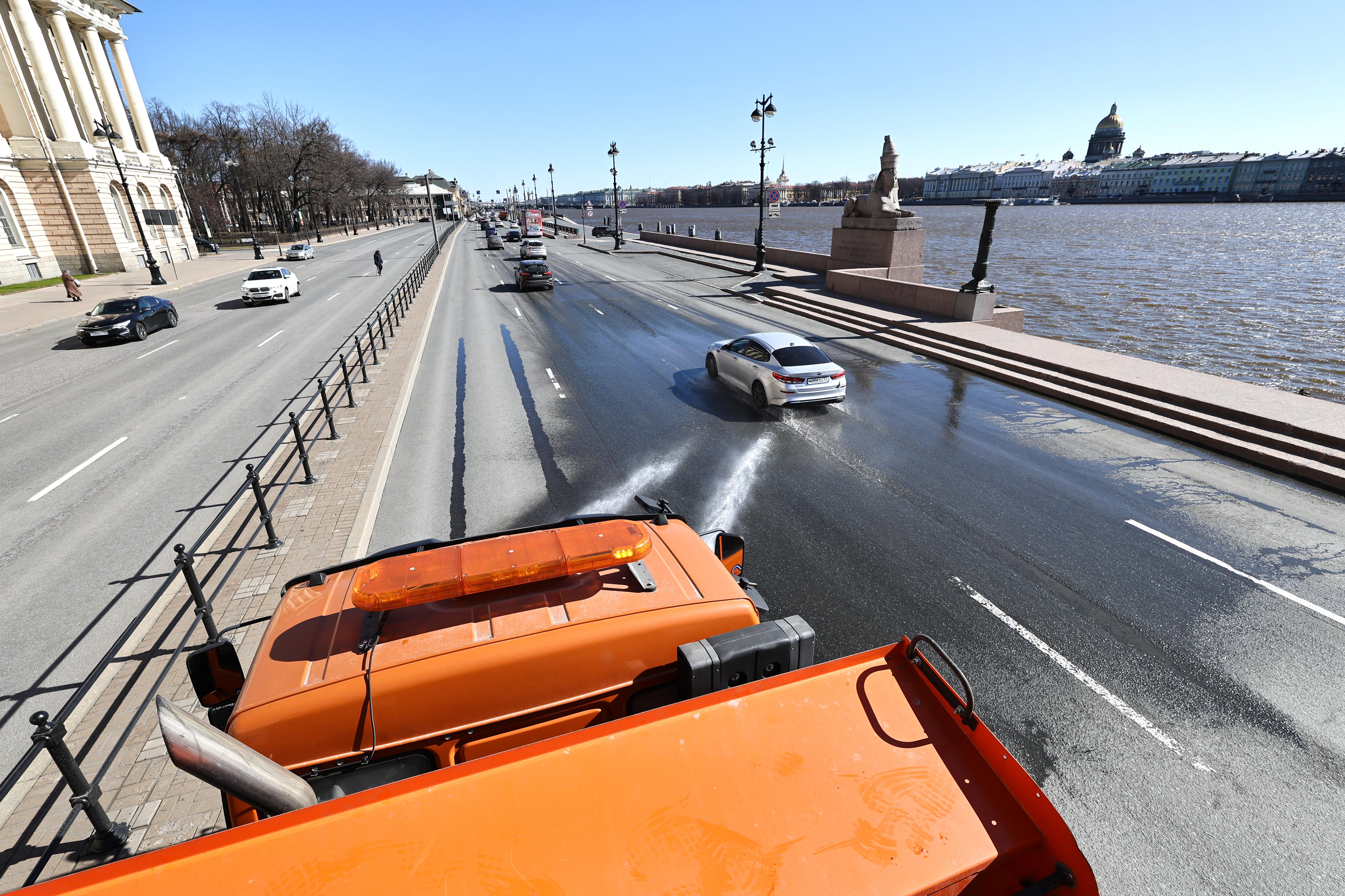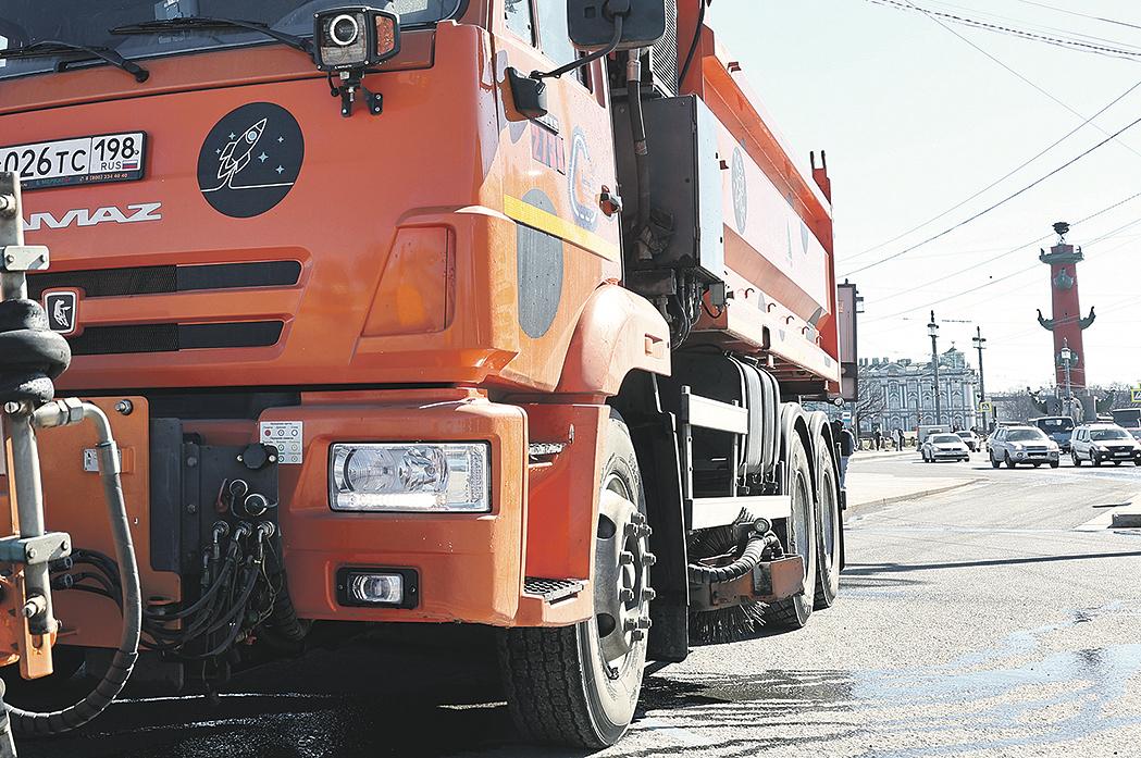 В период экстремальных снегопадов на Васильевском острове задействуют до 70 единиц специализированной техники, в том числе комбинированные дорожные машины. Сейчас, конечно, погода совсем другая, поэтому к КамАЗу присоединены щетки и водяные сопла.