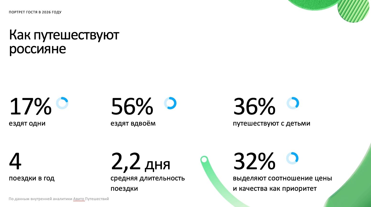В целом по России средняя длительность поездки составляет 3–4 дня, при этом почти половина путешественников (47%) отправляются в поездки вдвоем. Все чаще гости выбирают квартиры, апартаменты или дома как альтернативу гостиничному формату размещения, ориентируясь на гибкость и оптимальное соотношение цены и качества сервиса — этот фактор является ключевым для 29% пользователей.