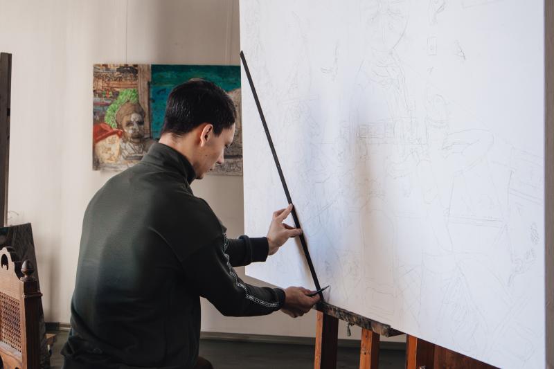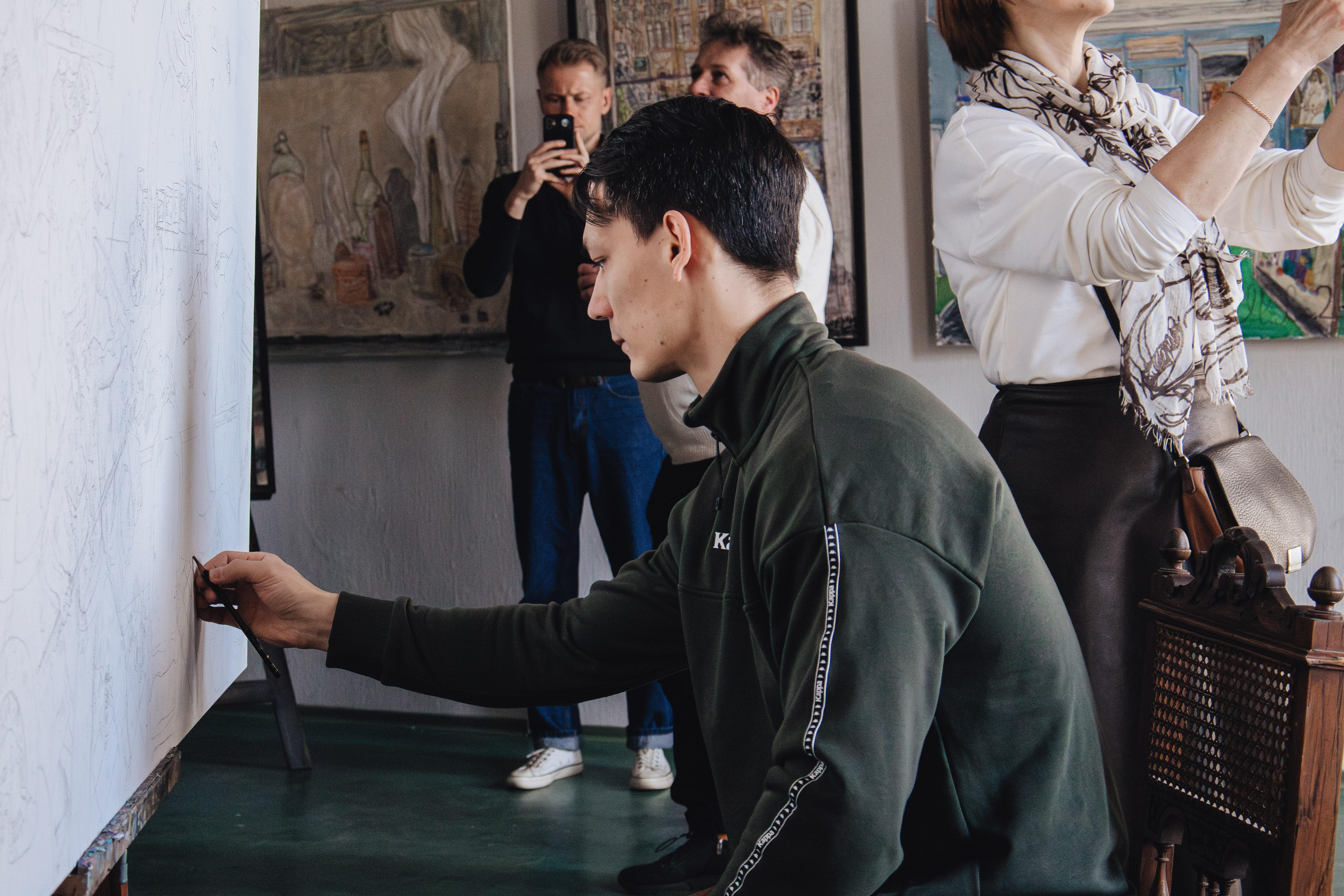 Далее посетители поднялись по винтовой лестнице туда, где жил и работал с 1906 по 1917 год Николай Рерих, возглавлявший Рисовальную школу Императорского Общества поощрения художеств. Современники отмечали, что живописец был необыкновенно трудолюбив, деятелен и многозадачен. Марина Нериновская показала уникальные фотографии, на которых видно, как раньше выглядела квартира Николая Рериха. Сегодня же там работают современные художники, и одного из них победители конкурса застали в процессе написания картины.