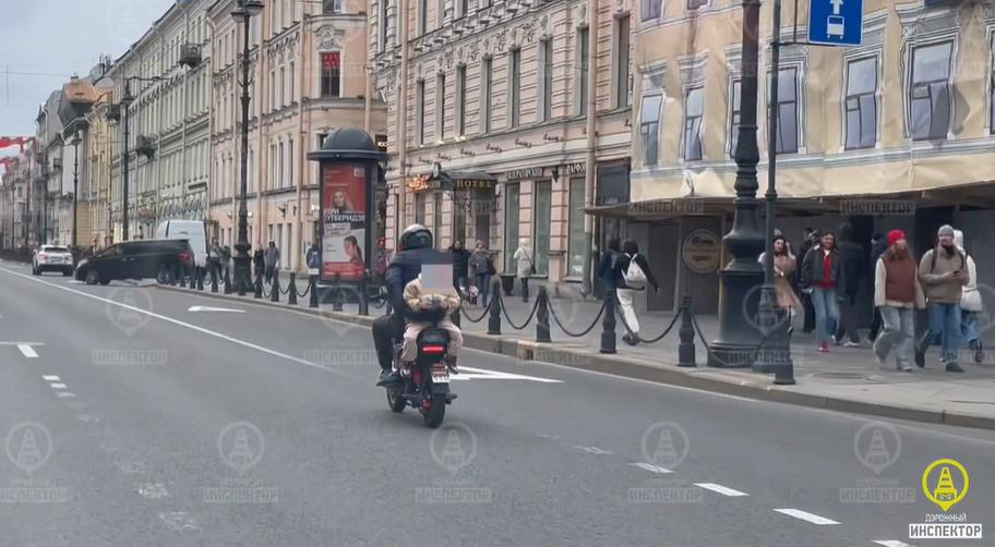 В центре Петербурга мотоциклист двигался по Невскому проспекту, одной рукой держась за руль, а другой – придерживая ребенка за спиной, пишет «КП-Петербург»