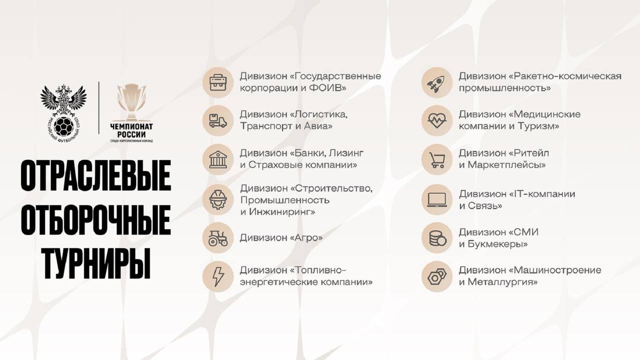Впервые в России пройдёт полноценный чемпионат среди корпоративных команд – с системой отборов по отраслям и регионам и официальным титулом чемпиона страны. РФС определил 22 отборочных турнира, которые состоятся с апреля по сентябрь, а финал примет Сочи с 1 по 5 октября.