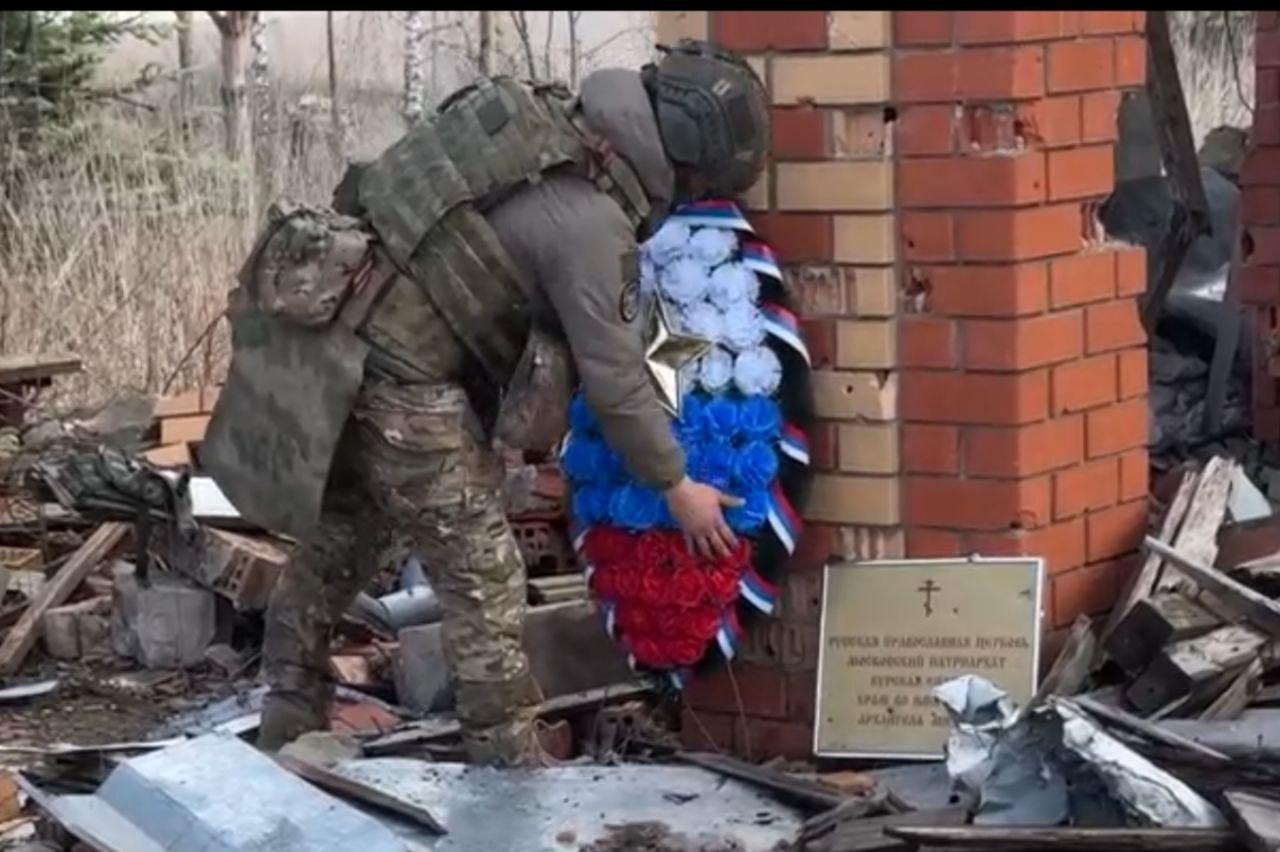 Несколько воинов шагают по направлению к полуразрушенной церкви. В руках венки и цветы. При входе на территорию храма военнослужащие осеняют себя крестным знамением. Хрустят под ногами обломки кирпича, в тишине слышен только ветер, гуляющий в выбитых оконных проёмах.