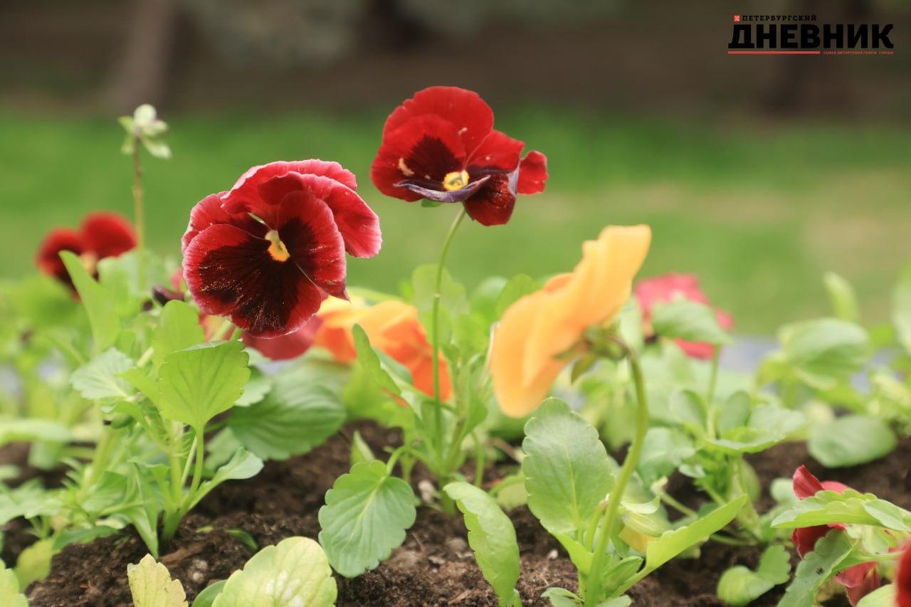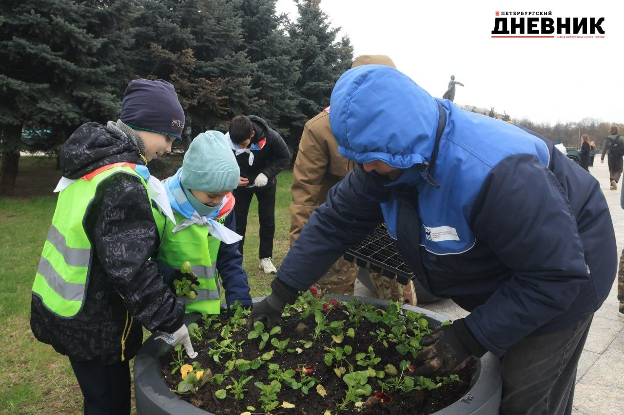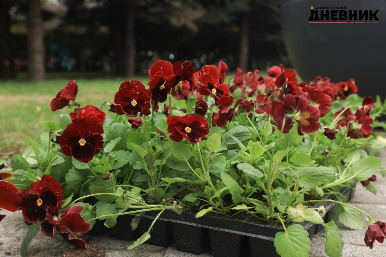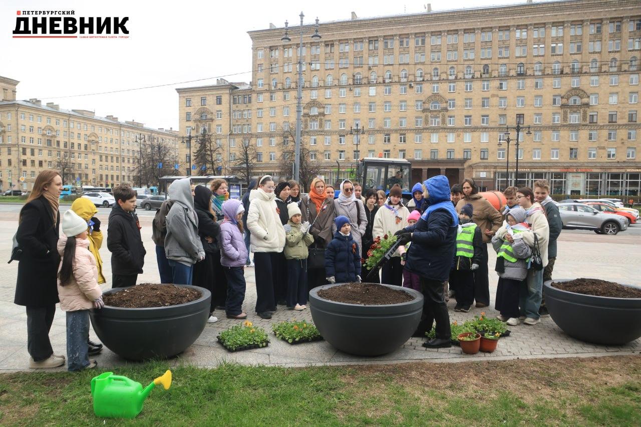 Фотокорреспондент «Петербургского дневника» запечатлел, как ко Дню Победы высаживали виолу на Московской площади.