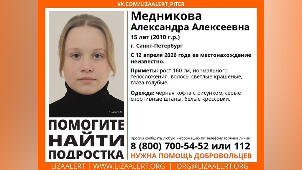 В Петербурге более 14 дней ищут 15-летнюю школьницу Александру, она ушла из дома и не вернулась, сообщают волонтеры отряда «ЛизаАлерт».